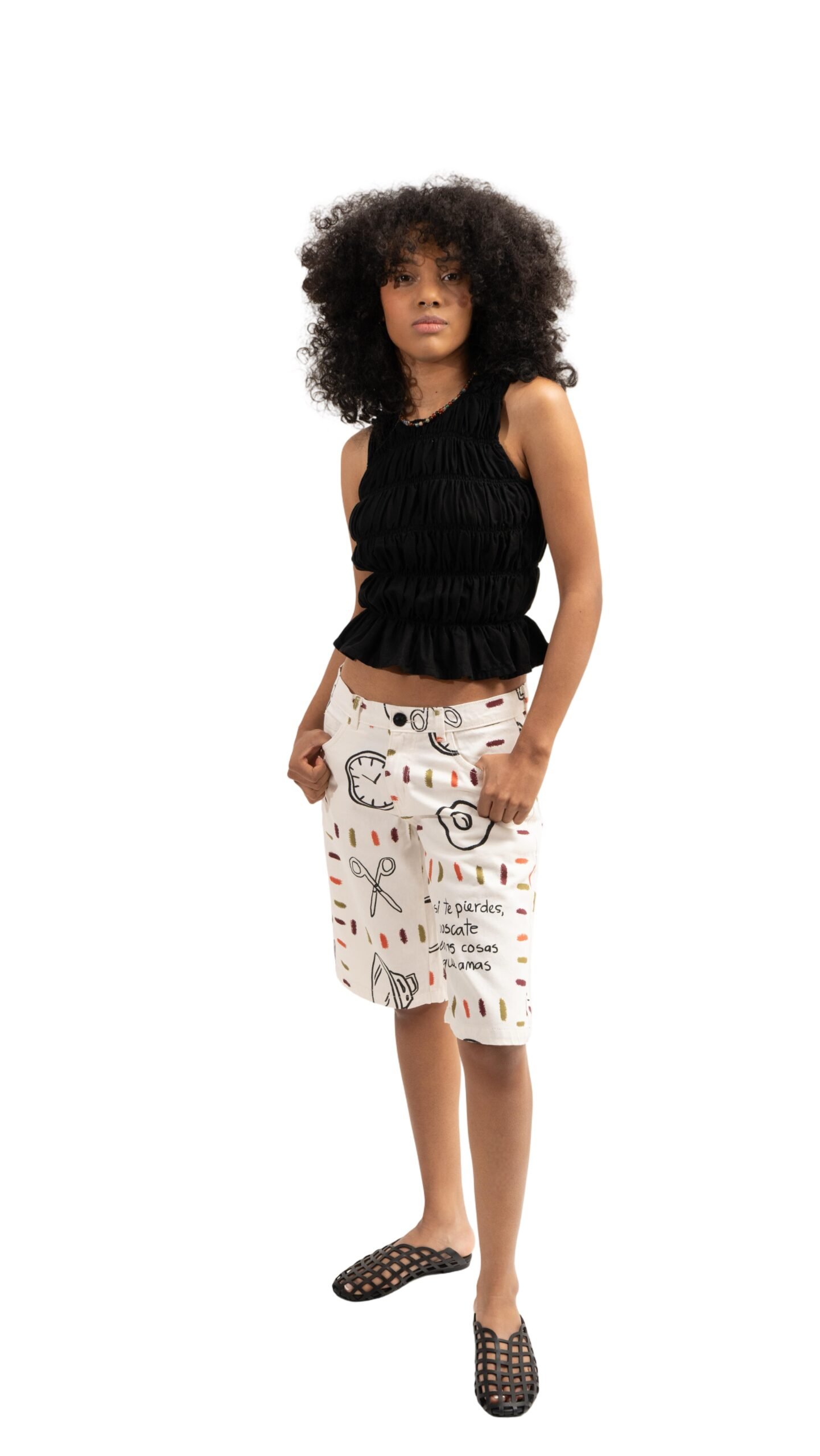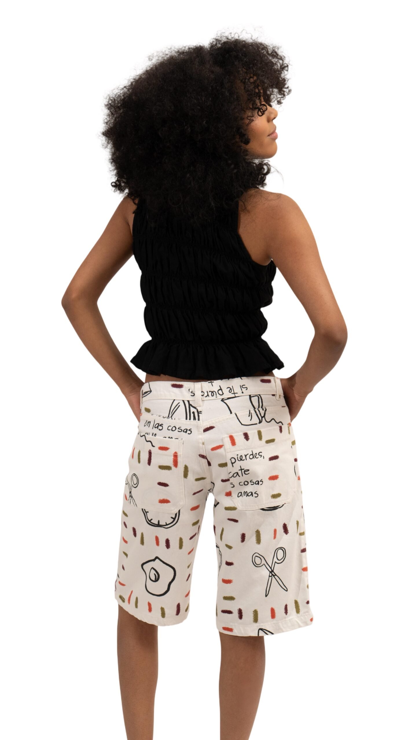 Nuestra bermuda CASITA está hecha en algodón rigido, con un estampado de colores que forman un cuadrado y dentro del cuadro hay objetos que son recuerdos de mi infancia.