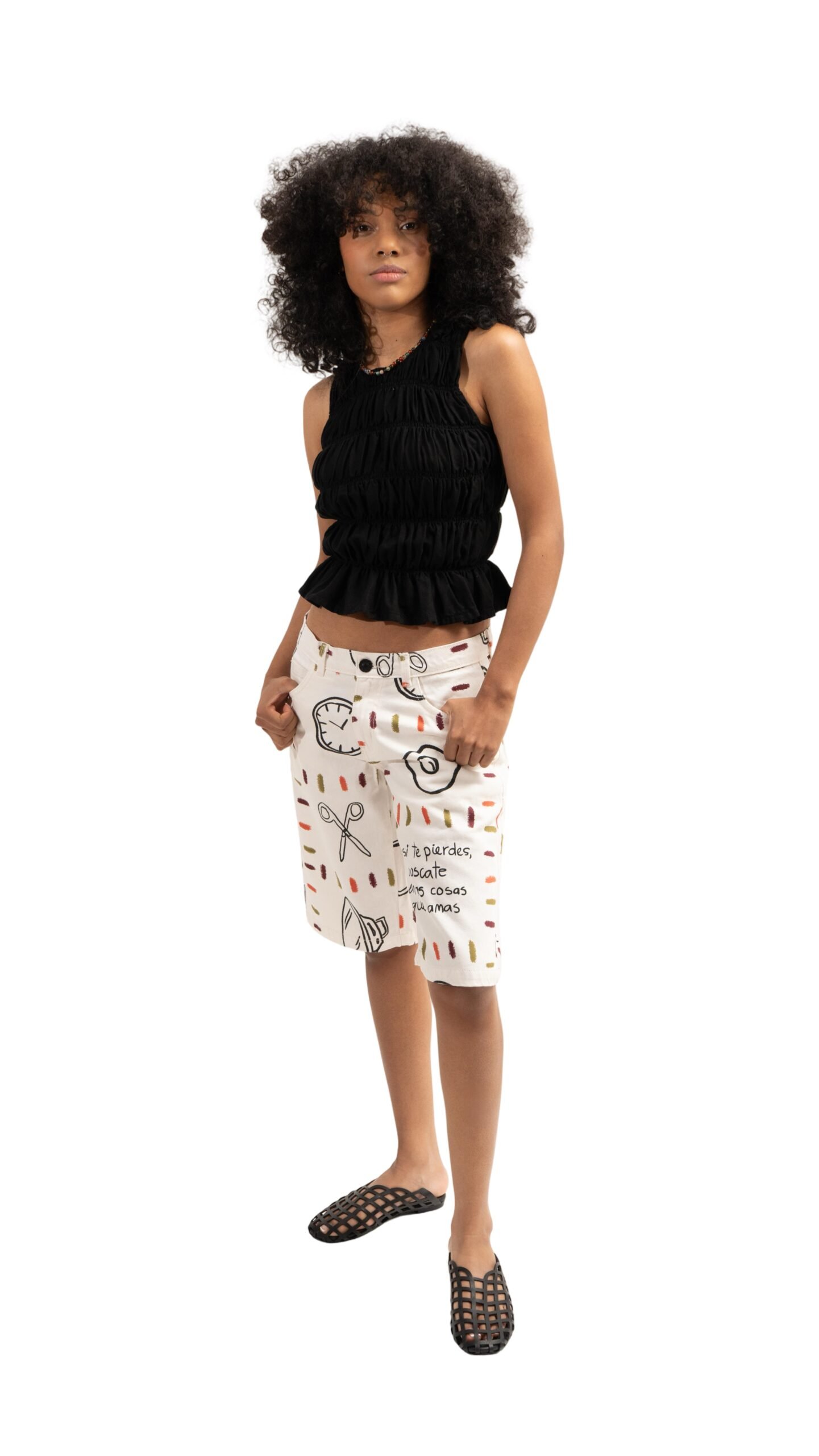 Nuestra chaqueta CASITA está hecha en algodón rigido, con un estampado de colores que forman un cuadrado y dentro del cuadro hay objetos que son recuerdos de mi infancia.