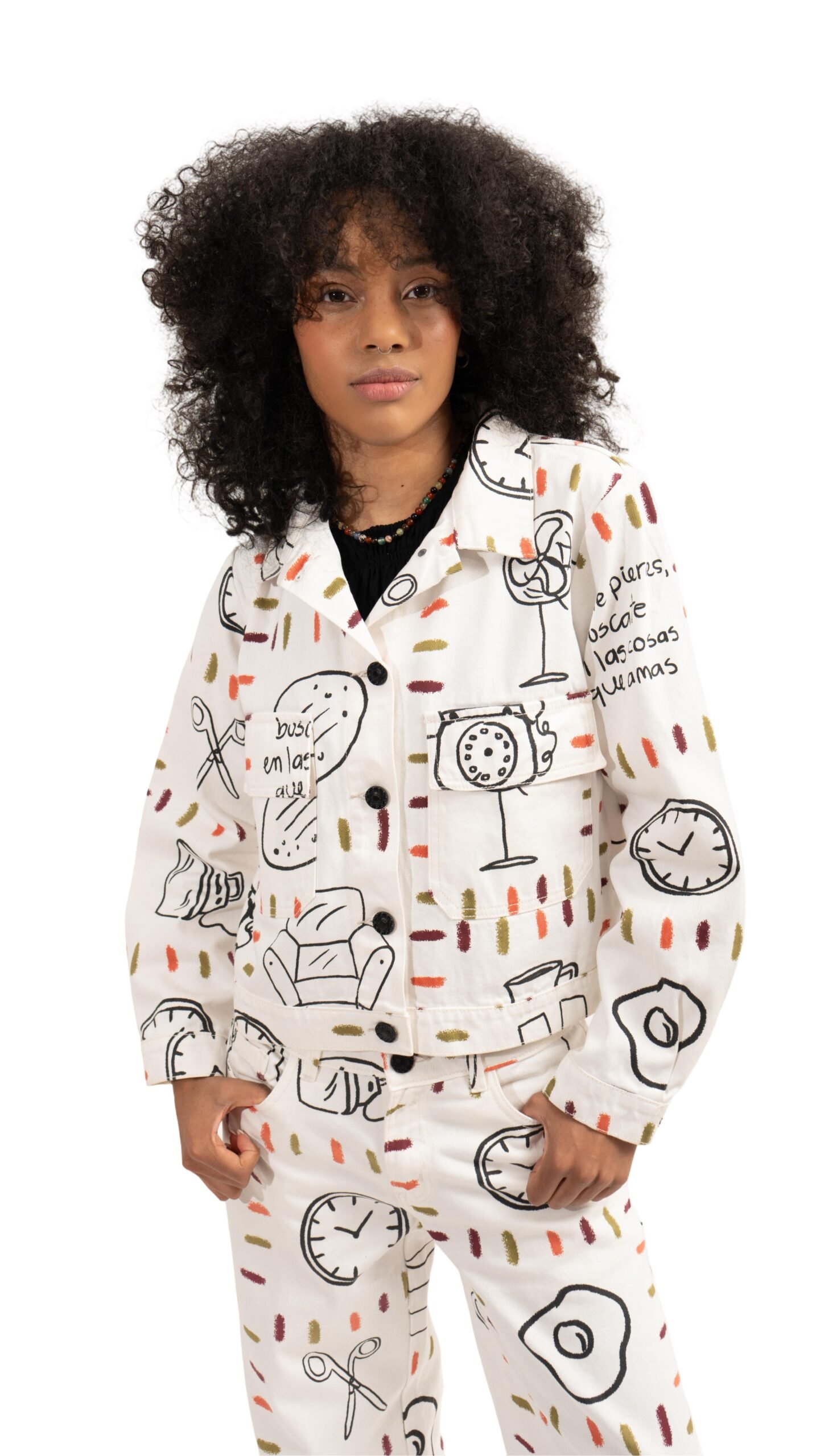 Nuestra chaqueta CASITA está hecha en algodón rigido, con un estampado de colores que forman un cuadrado y dentro del cuadro hay objetos que son recuerdos de mi infancia.