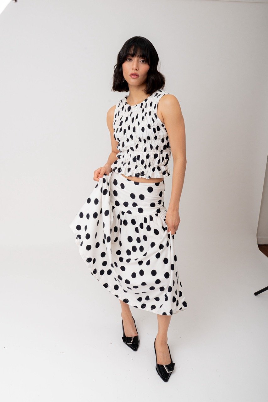 Nuestra falda Confeti es estampada tiene un fajón que llega a la altura de la cadera con caucho en la parte posterior y una falda semi redonda.