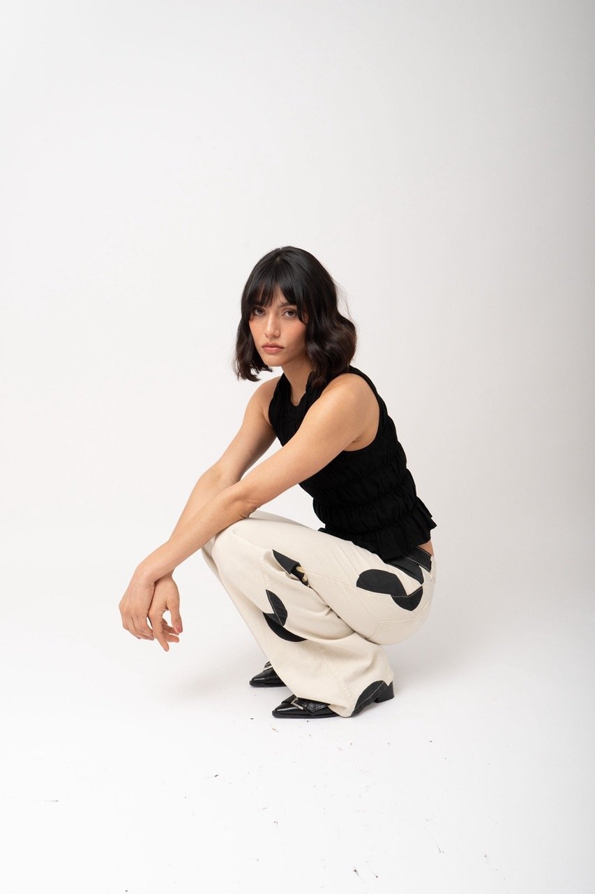 Nuestro jean Confeti esta hecho en algodón rigido, tiene bolsillos delanteros y posteriores, y un fit wide leg.