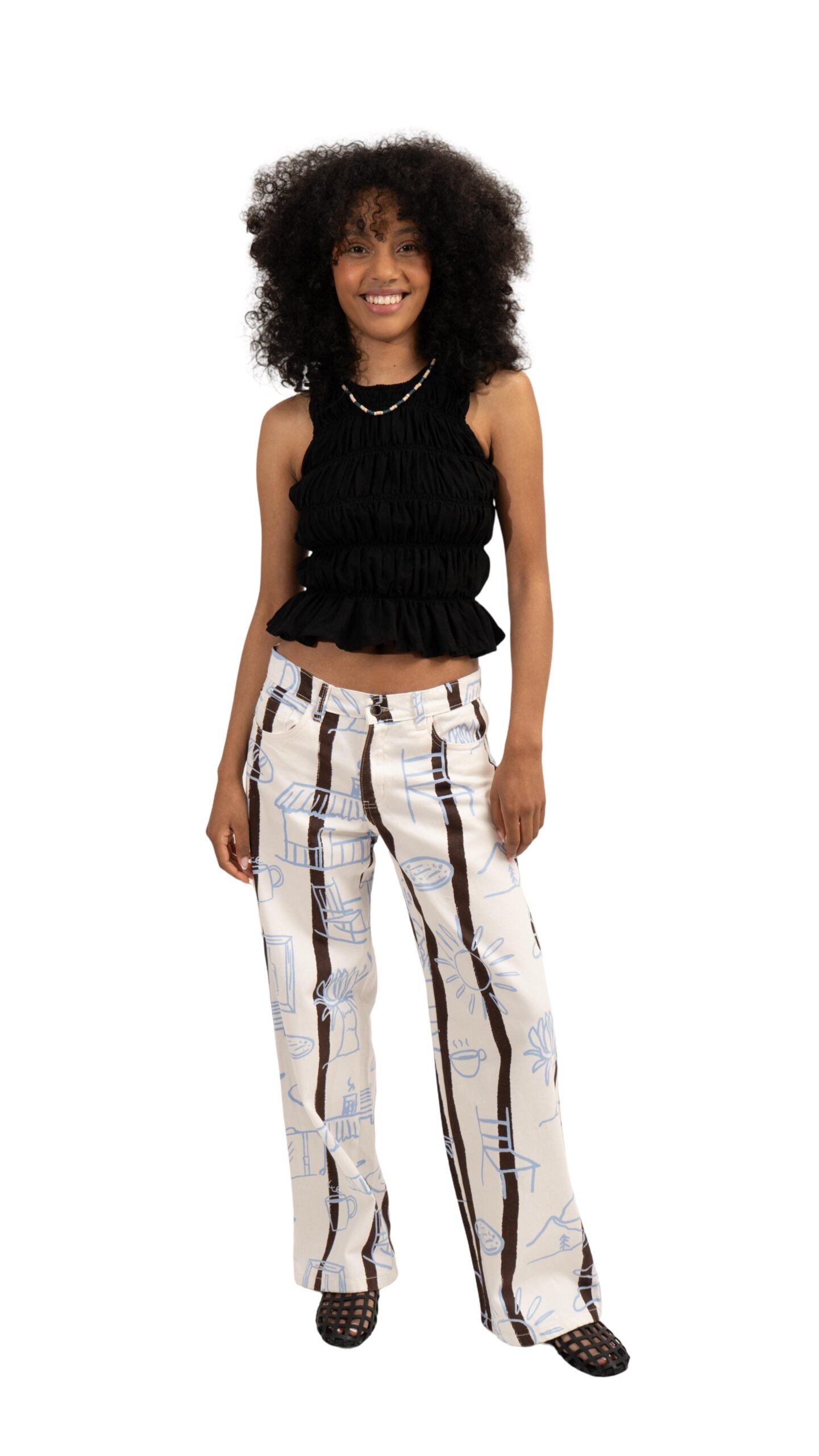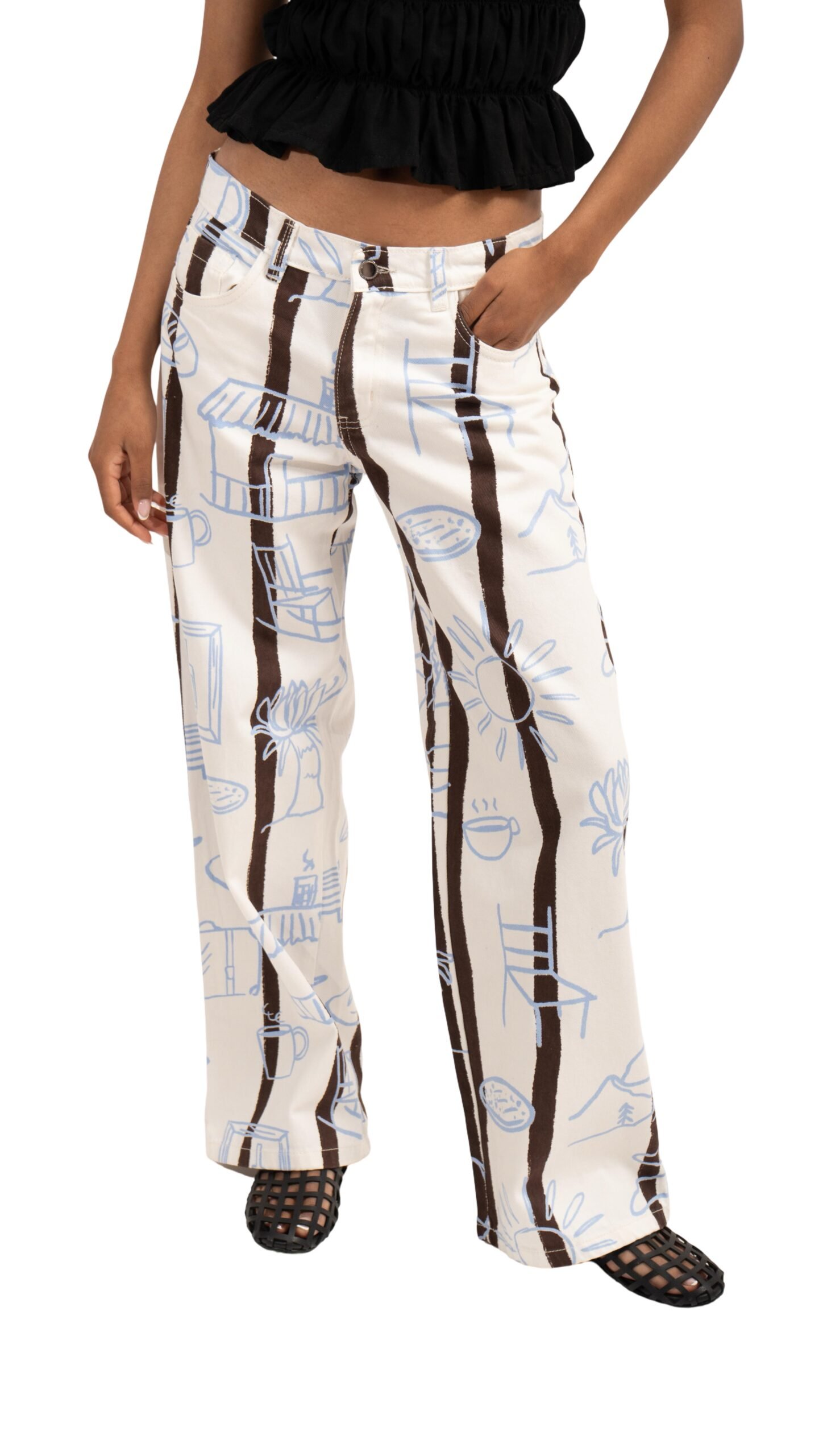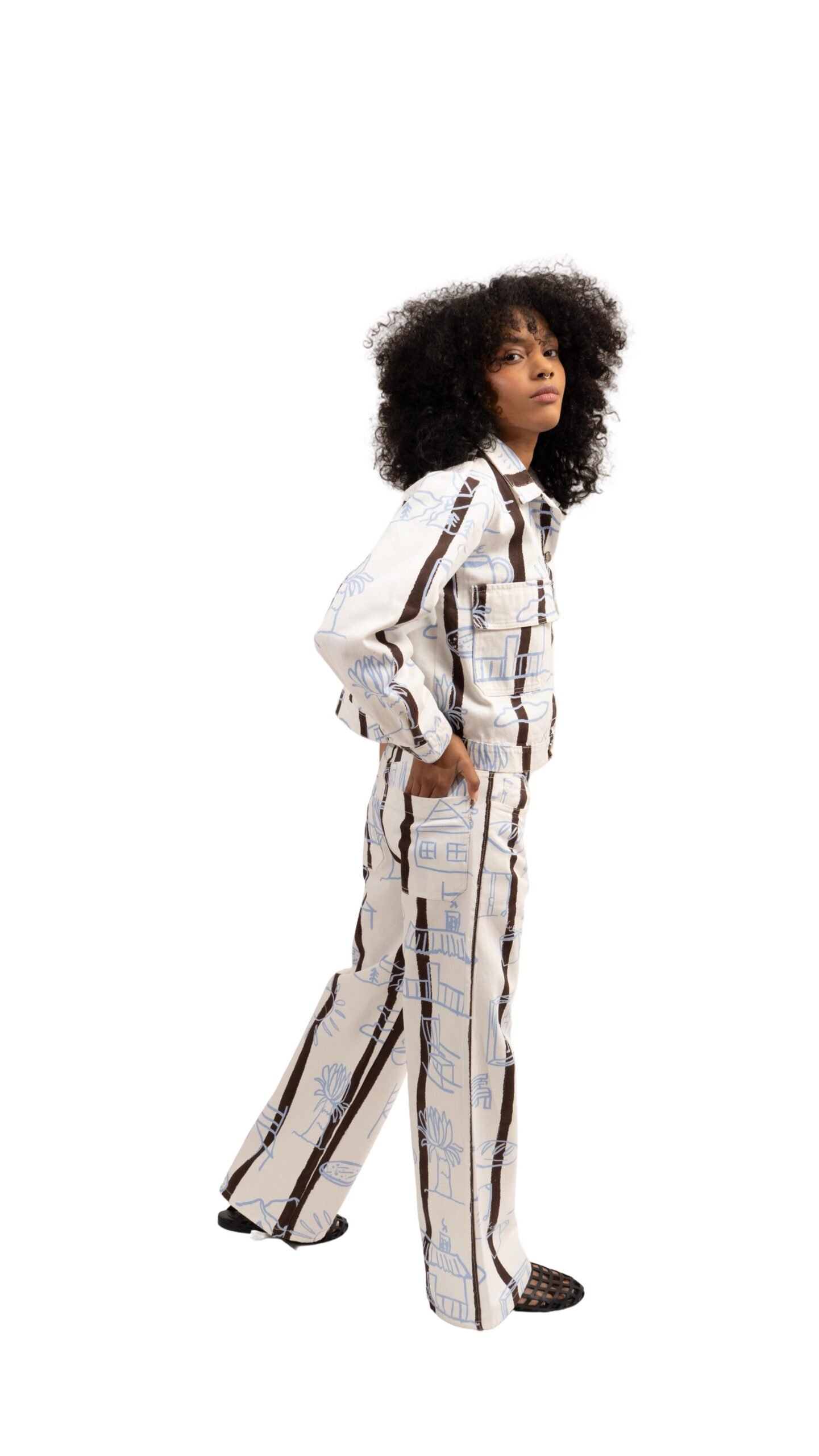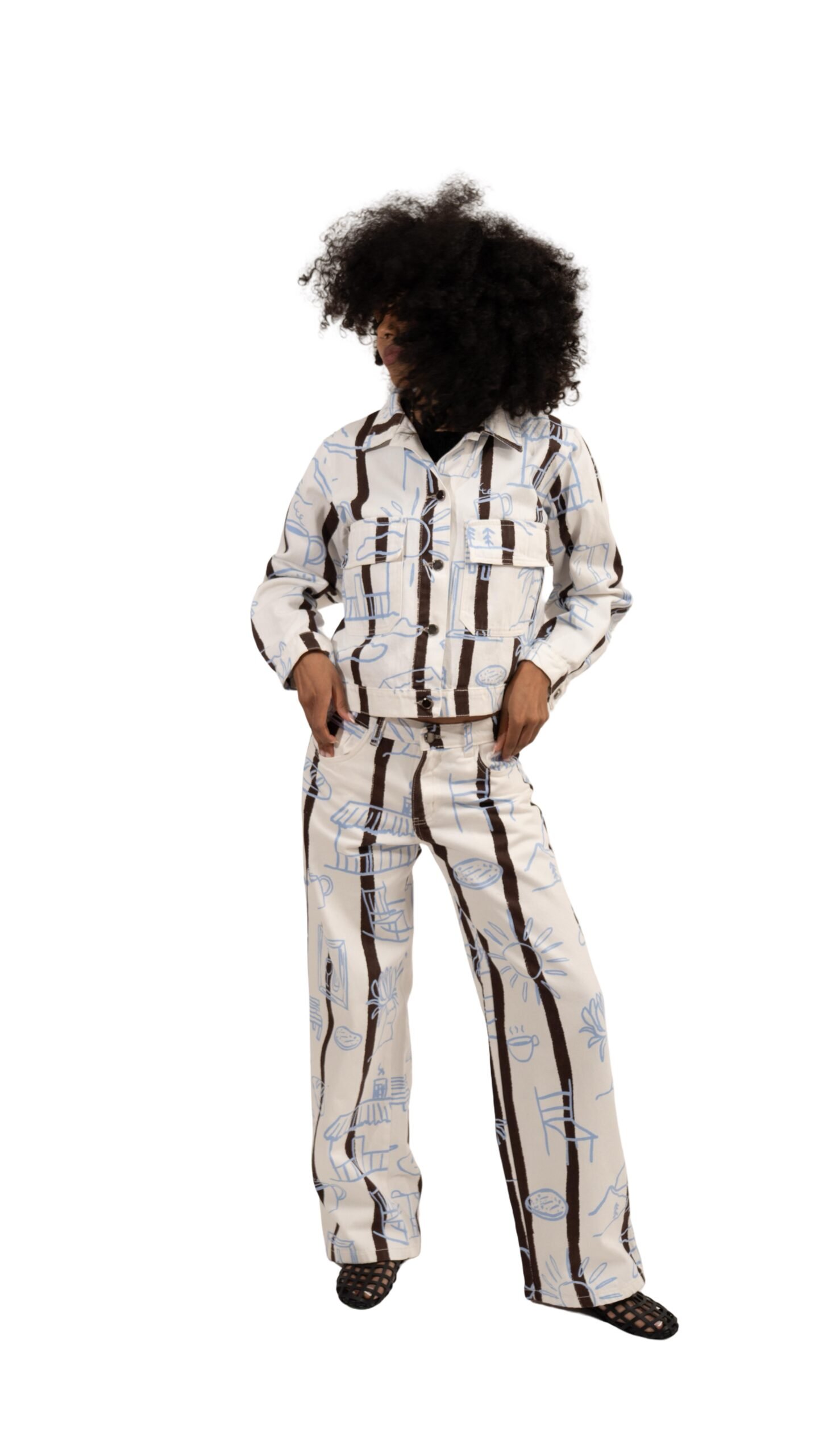 Nuestro jean PUEBLITO esta hecho en algodón, con un estampado de lineas cafes que representan las sillas de madera y garabatos en azul claro donde hay una taza de café, casitas, el sol y hasta montañas.
